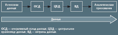 В рассматриваемых подходах аналитическая система строится на основе BI, в частности технологии хранилищ данных. При этом в общем случае выделяется следующая цепочка доставки информации (рис. 2): источники данных — оперативный склад данных — центральное хранилище данных — витрины данных (не обязательно) — аналитические приложения.