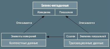 Метаданные — это данные о данных, которые могут описывать как контекстные, так и фактографические данные. Метаданные принято разделять на бизнес- и технические метаданные. Основное назначение бизнес-метаданных состоит в описании решаемой задачи (предметной области) для того, чтобы аналитикам было удобно ориентироваться во всех данных системы. В терминах многомерного моделирования данных бизнес-метаданными являются описания показателей и измерений. Примерами бизнес-метаданных могут служить описания показателей «Доход», «Количество проданной продукции», «Уровень удовлетворенности клиента» и измерения «Клиент», «Категория продукции», «Территориально-административное деление». Технические метаданные предназначены для ИТ-специалистов, занимающихся созданием или поддержкой системы , и описывают структуры хранения данных и их связь с понятиями предметной области (бизнес-метаданными).