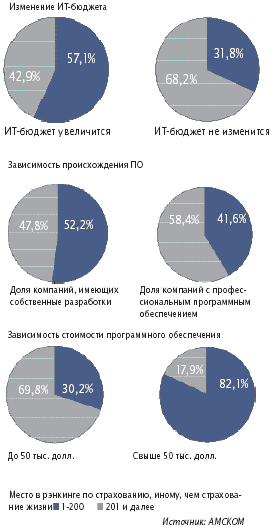 В частности, средний ИТ-бюджет страховой компании, занимающей c 1 по 100-е место по премиям в области добровольного страхования, иного, чем страхование жизни, составляет 103,9—113,3 тыс. долл., с 100 по 200-е место — 52,3—56,8 тыс. долл., ниже 200-го места — 39,6 тыс. долл. и менее вплоть до отсутствия затрат (использование ранее купленной техники и программного обеспечения, отсутствие стратегии развития и соответственно внятной потребности в автоматизации).