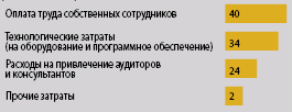 Специалисты AMR проанализировали также структуру затрат на соблюдение нормативных требований. Опрошенные заявили, что, несмотря на довольно значительные инвестиции в технологии, на стоимость труда (как сотрудников информационной службы, так и других работников), консультаций и аудита приходится примерно две трети от общей суммы расходов. По словам Хагерти, как правило, на начальном этапе компании больше тратят на консультации и меньше на технологии, однако впоследствии сумма вложений в техническое обеспечение растет.
