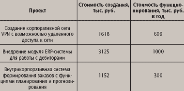Поскольку деятельность ИТ-службы «НП Трейд» слабо формализована и прошлый опыт не накапливается на регулярной основе, для оценки затратных составляющих проектов был использован упрощенный метод ТСО (табл. 3). При расчетах стоимости проектов учитывались два компонента: