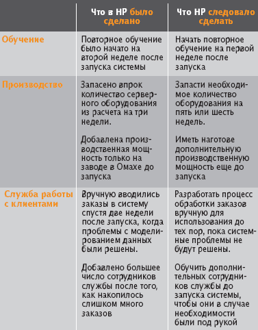 Заголовки газет утверждали, что виной всему ИТ-катастрофа, но действительной причиной катастрофы в HP стали несколько относительно небольших ИТ-ошибок, которые, как снежный ком, превратились в намного более значительную проблему для бизнеса: неспособность справиться с задолженностью по невыполненным заказам. Эту катастрофу можно было бы предотвратить, не пытаясь ликвидировать любую возможность для совершения ошибок при масштабном переносе ИТ-системы, что практически невозможно, а заранее просчитав все последствия для корпоративной цепочки поставок, к которым может привести осуществление подобных проектов.
