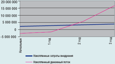 Точка безубыточности проекта внедрения корпоративной системы информационной безопасности определяется как точка пересечения графиков накопленных затрат проекта внедрения и накопленного денежного потока (см. рис.), где по вертикальной оси отложены затраты на проект, и равна 1,6 лет.