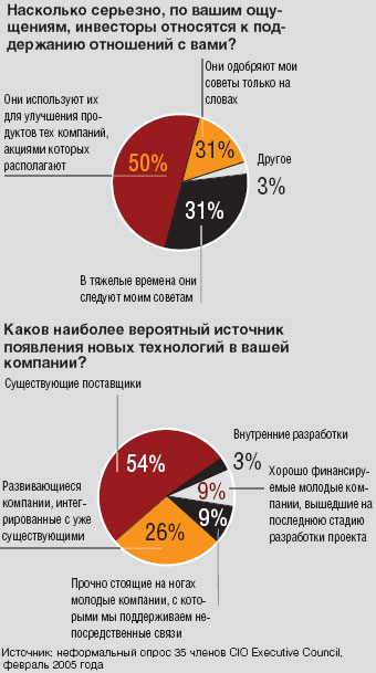 Работа венчурных капиталистов (инвесторов, вкладывающих деньги в новые предприятия) предполагает хорошее знание новых технологий, состояния набирающих силу поставщиков услуг и изменения обстановки в сфере ИТ. За обладание соответствующей информацией они готовы отдать все, что угодно. Но вот взаимодействие руководителей информационных служб с сообществом инвесторов до сих пор оставляет желать лучшего. На одном из заседаний совета CIO Executive Council лишь менее половины из 35 присутствовавших отметили, что за последний год вступали в контакт с инвесторами. Нехватка времени, необходимость решения других приоритетных задач и скептическая оценка возможности извлечения какой-либо выгоды из подобных отношений останавливает директоров ИТ-служб от активизации усилий в данном направлении.