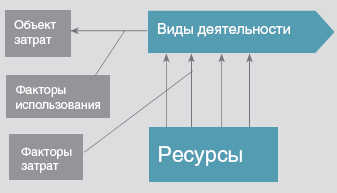 Принципиальная схема учета затрат в данной модели приведена на рис. 1. Конечный продукт или услуга, для которых рассчитываются затраты, называется в этой модели объектом затрат. Работы, необходимые для получения объекта затрат, названы видами деятельности. Сотрудники, труд которых потребляется в рамках видов деятельности, необходимые при этом материалы и оборудование, а также внешние услуги рассматриваются как ресурсы (Кокинс Г., Страттон А., Хелблинг Д. Учебник по методологии функционального учета затрат. М.: ВИП Анатех, 2000).