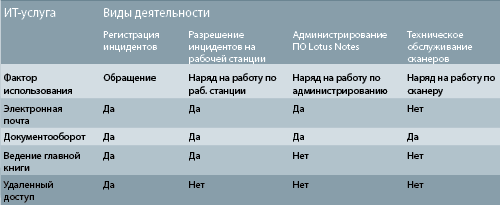 Пример соотнесения видов деятельности, факторов использования и ИТ-услуг