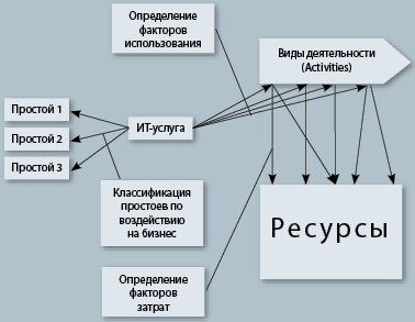 Каждому виду деятельности назначается свой натуральный измеритель — фактор использования. Примеры факторов использования приведены в таблице. Под обращением понимается любой запрос пользователя на Help Desk, допустимый в рамках процесса управления инцидентами, — звонок по телефону, письмо, отправленное через электронную почту, web-форма и т. д. Под нарядом на работу понимается выданное задание в рамках процесса. Например, в рамках процесса управления инцидентами нарядом на работу может быть устранение инцидента на рабочей станции пользователя или, в рамках регламентных работ — наряд на работу по администрированию и т. д. Аналогичная работа проводится для ресурсов: их каталогизируют, им назначаются факторы затрат и они соотносятся с видами деятельности. Примеры факторов затрат приведены в [1].