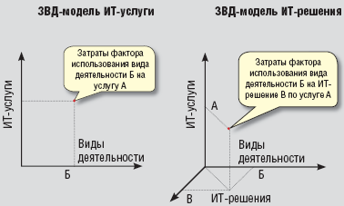 Модель учета затрат по видам деятельности (ЗВД) ИТ-услуги [1] связывает потребление ИТ-услуги определенного объема и качества с потреблением определенных видов деятельности и вытекающим из него потреблением ресурсов. Денежная оценка потребленных ресурсов составляет себестоимость ИТ-услуги. Такой подход позволяет описать текущий состав затрат на ИТ-услугу и довольно точно прогнозировать изменение затрат в связи с изменением требований к ее объему и качеству при неизменной технологической платформе.