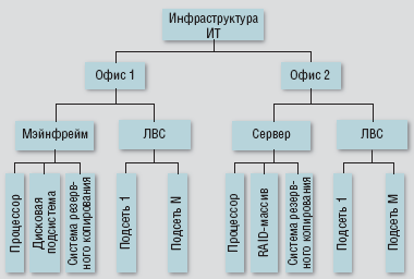 Для регулярного использования расширенной ЗВД-модели необходима привязка видов деятельности к ИТ-решениям. В рамках модели процессов ITSM можно использовать базу данных управления конфигурациями. Библиотека ITIL рекомендует иерархическое представление базы данных конфигураций. Верхним уровнем в этом случае становится ИТ-инфраструктура организации в целом, следующим — ее основные блоки, далее — основные части этих блоков и т. д. (рис. 3).