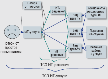 ИТ-услуги и ИТ-решения соотносятся как «многие ко многим», то есть одна ИТ-услуга обеспечивается несколькими ИТ-решениями, а одно ИТ-решение может обеспечивать несколько ИТ-услуг. С одной стороны, группировки затрат по ИТ-услугам и ИТ-решениям независимы друг от друга — группировка по ИТ-услугам показывает отнесение затрат на конечный продукт ИТ-службы (темные линии на рис. 2), а по ИТ-решениям — связь затрат с используемыми техническими платформами и решениями (светлые линии на рис. 2). С другой стороны, обе группировки затрат связаны между собой. Потери от простоев пользователей измеряются для ИТ-услуг и затем распределяются по ИТ-решениям, вызвавшим эти простои. Это позволяет рассматривать потери от простоев в затратах на ИТ-решения не усредненно, как в классической модели TCO [2], а в привязке к конкретному набору ИТ-услуг, для поддержки которого используется решение.