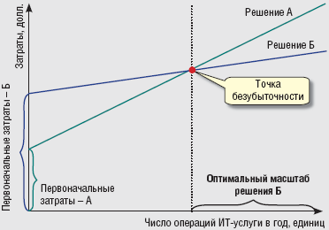 Наконец, важный фактор — соотношение масштаба проектируемой ИТ-услуги или услуг и экономически оптимального масштаба ИТ-решения. Например, серверные решения с высокой доступностью, такие, как HP Superdome, имеют длительный жизненный цикл, а эксплуатационные затраты на единицу их мощности сравнительно невелики. Тем не менее, их применение при незначительном масштабе ИТ-услуги невыгодно вследствие высокой первоначальной цены решения (рис. 4, левее точки безубыточности).