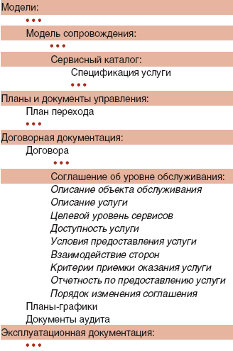 Следует помнить о том, что договорная документация регламентирует только узкую область договорных взаимоотношений сторон. В процессе аутсорсинга есть также и другие виды информационного взаимодействия (по сервисам, моделям сопровождения, различным финансовым аспектам, управлению аутсорсингом). Для каждого из них должен быть свой набор документов. Так, основополагающим документом, в котором закладывается качество услуги, является ее спецификация, входящая в состав каталога услуг. Спецификация используется при подготовке и SLA, и эксплуатационной документации на услугу.