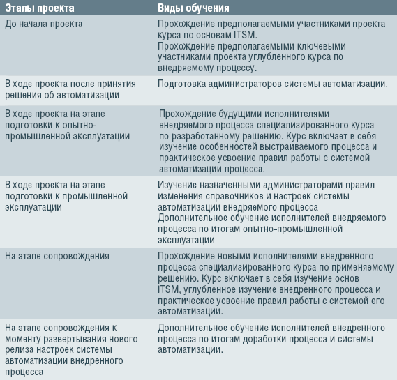 Учебные мероприятия, необходимые на разных стадиях проекта