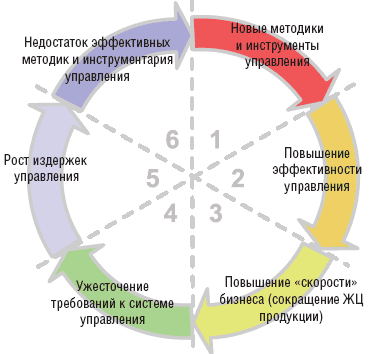 Появление новых методик корпоративного управления и ИТ-инструментария, автоматизирующего их использование, приводит к повышению эффективности системы управления бизнесом в целом. Это, в свою очередь, способствует ускорению бизнеса, делая жизненный цикл его продукции короче, а сам бизнес — более чувствительным к издержкам, связанным с потерей времени. В результате формируются новые, более жесткие требования к системе управления, приближающие ее к системе управления бизнесом на рынках, изменяющихся в режиме реального времени. Модернизация требований приводит к росту издержек управления, и в результате опять появляется спрос на новые, более эффективные методики и инструментарий корпоративного управления.