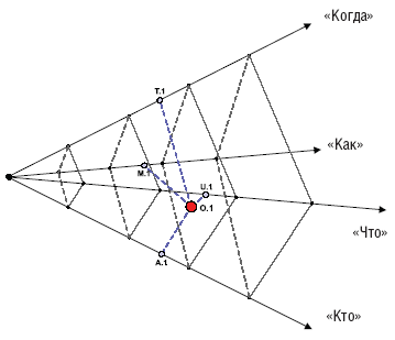 Проиллюстрировать это можно следующим образом (см. рис. 3). Допустим, задача состоит в реализации одного действия — операции, которая входит в некий бизнес-процесс. Операция O.1 имеет следующие координаты: A.1 — исполнитель, ответственный за выполнение O.1; U.1 — объект операции, участвующий в O.1; T.1 — начало и значение временного диапазона, когда должна быть начата и в течение какого времени выполнена O.1; M. 1 — методика, в соответствии с которой выполняется O.1.