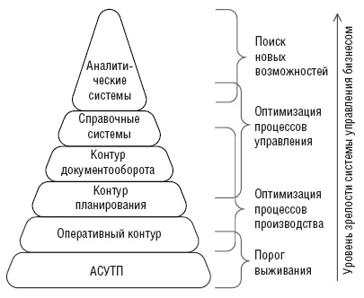 Длительные и целенаправленные усилия по удовлетворению потребностей современного бизнеса в системах автоматизации принесли свои плоды: выкристаллизовалась инфраструктура корпоративных информационных систем, удовлетворяющая все потребности корпоративного управления. Она включает в себя шесть контуров управления данными (см. рис. 5). Каждый контур решает свой круг задач, но, главное, его наличие напрямую зависит от уровня зрелости системы корпоративного управления, начиная от самого верхнего уровня и заканчивая линейным менеджером. Чем уровень зрелости выше, тем с большей вероятностью можно встретить в корпорации ту или иную информационную систему (см. рис. 5).