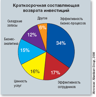 85 % компаний, использующих в своем бизнесе технологию RFID, добились возврата инвестиций (return on investment, ROI) в течение пяти лет. Тем не менее все они полагают, что основной экономический эффект им еще предстоит получить в будущем. Хотя технология радиочастотной идентификации нашла широкое применение относительно недавно, сама по себе она не нова. Согласно опросу Aberdeen Group, 10 % компаний используют ее уже более пяти лет. Среди этих первопроходцев львиную долю составляют гиганты с оборотом более 5 млрд. долл. в год. Их инвестиции в RFID также внушительны: около 1,5 млн. долл., что в три раза больше среднего проекта по внедрению RFID. Краткосрочная составляющая возврата инвестиций очень важна: во-первых, она более доступна для измерения, во-вторых, именно она способна убедить руководство компании в правильности выбранного курса. По мнению опрошенных, из всех составляющих ROI самой значительной является повышение эффективности процессов. Далее следуют повышение производительность труда и ценности предоставляемых услуг.