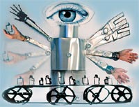 Это может показаться фантастикой, но машинное зрение действительно существует. Консалтинговая компания Vision Systems International оценивает общую емкость североамериканского рынка систем машинного зрения в 1,5 млрд. долл. В настоящее время технология используется в основном для контроля, в особенности при производстве полупроводников и электронной техники, но она быстро развивается. Одно из новейших приложений называется «сервозрение» и используется для контроля над взаимодействием такого инструмента, как окрасочный пистолет, с конвейером непрерывно движущихся раскачивающихся объектов.