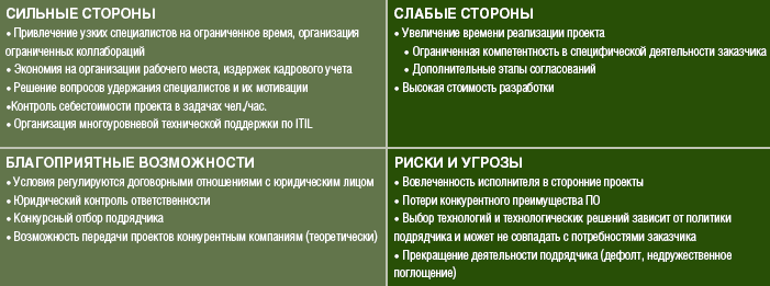 Изыскательские работы с целью выбора архитектуры решений тоже нужно проводить своими силами. «Отдавать выбор архитектуры на откуп нельзя. Менеджер продаж любой аутсорсинговой компании всегда будет говорить только о положительных сторонах своего продукта. Доверять исследованиям, проводимым поставщиками, тоже не следует, — считает Дамбраускас. — Я, как заказчик систем, нахожусь в сложном положении — должен сам проводить исследование и выбирать на свой страх и риск технологическую платформу». Собственно разработку программного обеспечения, считает Дамбраускас, имеет смысл практически полностью отдать на аутсорсинг.