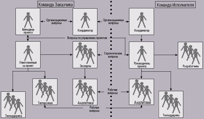 Хотелось бы сказать об организации внедрения и комплектовании команды внедрения, поскольку это ключевой вопрос для успешного ведения и завершения проекта. При формировании проектной группы со стороны заказчика обычно выделяется куратор проекта из числа заинтересованных топ-менеджеров уровня заместителя генерального директора либо руководителя департамента (обязанности — периодическое решение организационных проблем, проведение совещаний); назначается менеджер проекта из числа специалистов-руководителей (занятость — 30–40% рабочего времени); создается проектная группа из числа занятых в предметной области специалистов (2–3 человека), которые будут выполнять функции экспертов-идеологов модели (занятость до 40% рабочего времени); назначается один-два специалиста сферы ИТ + предметная область, который в будущем будет играть ключевую роль в эксплуатации и развитии системы (занятость 100% рабочего времени). Формирование проектной команды закрепляется приказом по предприятию с указанием процента рабочего времени на внедрение. Структура проектной команды представлена на рис. 2.