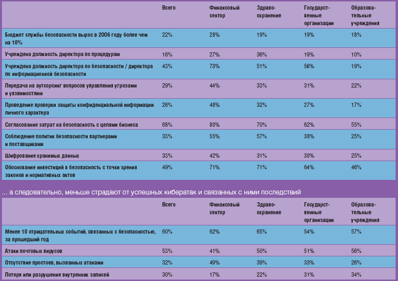 Совместное исследование журналов CIO, CSO и компании PricewaterhouseCoopers, в котором принял участие 7791 респондент из 50 стран, продемонстрировало, что все больше членов высшего руководства (генеральных и финансовых директоров, руководителей ИТ-служб и служб безопасности, вице-президентов и директоров по ИТ и информационной безопасности) организаций, работающих в самых разных отраслях и представляющих как частный, так и государственный сектор, продолжают совершенствовать технологии и политики информационной безопасности, однако темпы улучшений несколько снизились по сравнению с 2005 годом. Финансирование вопросов безопасности увеличивается, в некоторых случаях рост бюджетов выражается двузначными процентными числами. При таком уровне безопасности люди чувствуют себя достаточно уверенно. Возможно, это объясняется тем, что в течение последнего года их сети не подвергались серьезным атакам вирусов и червей.