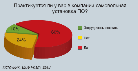 Компании все чаще вынуждены мириться с существованием теневой ИТ-культуры, а именно с самовольной установкой бесконтрольных программ для компенсации недостаточной эффективности и оперативности штатных ИТ-сотрудников. Как показало исследование, проведенное Blue Prism, такое поведение сотрудников наблюдается в двух третях компаний, а его причинами становятся бюджетные и ресурсные ограничения. Лишь 24% респондентов полагает, что несанкционированного использования ПО в их организациях не существует, а еще 10% затруднились ответить. Похоже, пользователи не верят, что ИТ-отдел может их обеспечить всеми необходимыми средствами. Это и ведет к созданию теневой ИТ-культуры, когда пользователи начинают обеспечивать себя всем необходимым для комфортной работы сами. В своей недостаточной эффективности ИТ-отделы винят главным образом недостаток ресурсов. Тем не менее, 24% опрошенных считают, что число запросов от пользователей на изменения программного обеспечения рабочих станций неоправданно велико — это и ведет к их невыполнению.