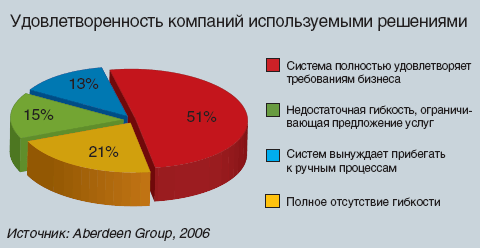 Поддержка изменяющихся бизнес-процессов компаний является одной из самых серьезных проблем, стоящих перед их руководством. Наибольшую озабоченность при этом вызывает недостаточный возврат инвестиций от ERP-систем. 51% опрошенных Aberdeen Group респондентов считает, что используемые ERP-решения не обеспечивают адекватную функциональность. Многие из них недостаточно гибки, чтобы оперативно реагировать на изменения в бизнес-процессах. Подавляющее большинство респондентов чувствует ограничения со стороны используемых приложений и из-за этого не может наиболее полно соответствовать требованиям заказчиков. Для достижения такого соответствия чаще всего приходится прибегать к ручным процессам. 21% опрошенных признали, что недостаточная гибкость применяемых систем вынуждает их ограничивать услуги, предлагаемые клиентам. Лишь 15% компаний заявили, что используемые ими приложения имеют желаемую гибкость и могут быть адаптированы ко всем бизнес-требованиям. 13% посетовали, что к их информационной системе неприменимо слово «гибкость».
