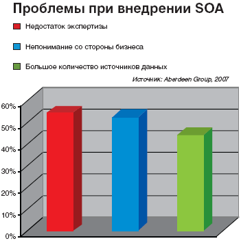 «Поскольку процесс внедрения SOA обычно протекает постепенно и с возрастающей сложностью, необходимо уже в самом начале решить все вопросы, связанные с управлением. От этого зависит, насколько окупится внедрение технологии, а также качество и слаженность работы предприятия, на обеспечение которых она изначально нацелена», — уверен Юрий Козлов, руководитель отдела системной интеграции компании Keyintegrity. Концепция SOA должна охватывать несколько важных «смежных» сфер, таких как управление сервисами на протяжении всего их жизненного цикла, политика по использованию сервисов, контроль за выполнением контрактов, а также классификация окружающих систем и приложений, содержащих метаданные. Для грамотного внедрения SOA прежде всего необходимы центры компетенции, укомплектованные специалистами в области SOA или хотя бы бизнес-пользователями, имеющими представление об этой технологии. А поскольку популярность SOA все более возрастает, таких специалистов остро не хватает.