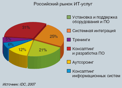 Объем российского рынка ИТ-услуг за 2006 год вырос на 23% и составил почти 3 млрд. долл. По прогнозам IDC, объем ИТ-услуг к 2011 году достигнет 7,84 млрд. долл. и при этом их доля на рынке ИТ вырастет с 20 до 25%. Крупнейшими сегментами рынка услуг стали консалтинг и разработка заказного ПО. На их долю в сумме приходится более 30%. Крупнейшим отраслевым рынком по затратам на услуги ИТ был финансовый сектор (21%), второе и третье места заняли телекоммуникационный и производственный секторы. По-прежнему значительную часть рынка составляют услуги по установке и технической поддержке оборудования. Несмотря на относительно высокие темпы роста, российский рынок ИТ-услуг существенно отстает от западного по уровню зрелости, констатируют аналитики. Тем не менее рынок все-таки развивается. По мере того как чистая дистрибуция становится менее прибыльной, растет число поставщиков услуг: бывшие дистрибьюторы вынуждены предлагать дополнительные услуги — от установки и поддержки до выполнения долгосрочных аутсорсинговых работ.