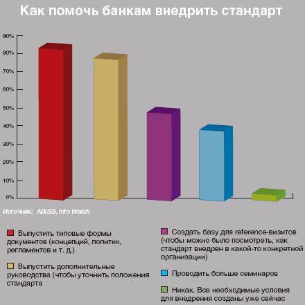 К сожалению, назвать стандарт панацеей не получается. Некоторое время назад Сообщество пользователей стандартов Центрального Банка Российской Федерации по обеспечению информационной безопасности организаций банковской системы (Сообщество ABISS, Association for Banking Information Security Standards) и компания InfoWatch провели исследование, которое выявило недостатки СТО БР ИББС. Опрос конечных исполнителей нормативов (см. диаграмму), банковских специалистов по информационной безопасности показал, что положения недостаточно формализованы, не хватает конкретных документов, политик, регламентов. В банках стандарт трактуют по-своему. Чтобы избежать ошибок и помочь внедрить его на практике, Центробанку следует выпустить типовые формы документов, дополнительные руководства, провести обучающие семинары.