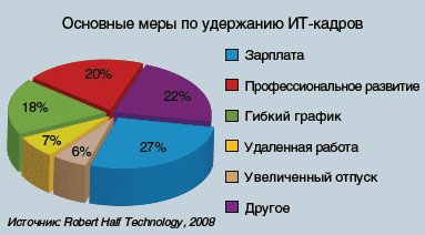 Удержание квалифицированных ИТ-сотрудников продолжает оставаться головной болью для руководства компаний. По данным Robert Half Technology, главными мероприятиями при обеспечении долгосрочной лояльности сотрудников становятся не только увеличение заработной платы, но и тренинги по повышению квалификации, а также возможность гибкого рабочего графика. Как показал проведенный опрос, в 27% компаний фокусируются на финансовых вопросах, 20% — на предоставлении возможностей профессионального развития, а 31% — на обеспечении баланса между личной жизнью и работой, главной частью чего является гибкий рабочий график. Другими распространенными средствами являются удаленная работа и предоставление дополнительных отпусков. Как подчеркивают аналитики, привлекательная зарплата всегда была важной частью эффективной программы удержания специалистов, однако это всего лишь один из элементов, который сам по себе не является панацеей. ИТ-профессионалы не меньше денег ценят возможность развиваться и реализовывать свои амбиции.