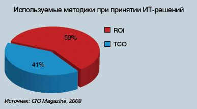 Как показало исследование, проведенное CIO Magazine, методика возврата инвестиций (return on investment, ROI) в прошедшем году доминировала при принятии ИТ-решений по сравнению с методикой совокупной стоимости владения (total cost of ownership, TCO). По мнению экспертов, используемая методика в первую очередь отражает взгляды на ИТ-департамент изнутри компании. При использовании показателя ROI на равных оцениваются не только затраты, но и ожидаемые эффекты от проекта, а значит, подразумевается, что ИТ могут приносить компании прибыль. В этом случае ИТ-отдел не является центром исключительно затрат и фактически встает в один ряд с бизнес-подразделениями. В целом это отражает находящую признание точку зрения, что ИТ-решения должны приниматься исходя из бизнес-преимуществ, даваемых используемыми технологиями. С этой позиции все предложения ИТ-отдела должны рассматриваться так же, как и любые идеи, направленные на повышение эффективности бизнеса.