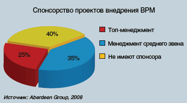 Для руководства компаний важно увидеть подводные камни проектов по внедрению систем управления бизнес-процессами (business process management, ВРМ), чтобы внедряемые решения не просто работали, а работали хорошо. Как показало исследование Aberdeen Group, главной проблемой является то, что внедрение систем ВРМ — это в меньшей степени технический процесс, в гораздо большей степени требуется работа с людьми и процессами. Основная часть проектов является организационной, и именно на ней спотыкаются многие компании. Организационными стали и две главные названные компаниями проблемы: обоснование инвестиций в ВРМ и сложности в достижении необходимого уровня сотрудничества с бизнес-специалистами. Во многом это происходит из-за того, что зачастую у таких проектов не бывает бизнес-спонсора из числа топ-менеджеров. Несмотря на недостаточную поддержку, компании решаются на проект, и неудивительно, что большая их часть оказываются проваленными. Лишь четверть проектов имеют поддержку топ-менеджеров, заинтересованных во внедрении ВРМ, а 40% вообще не имеют спонсора проекта. Кроме того, лишь в 15% случаев проект имеет четко определенные цели и задачи.