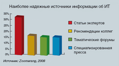 ИТ-сотрудники утверждают, что для качественного выполнения профессиональных обязанностей им необходимы тренинги и доступ к достоверной информации, в том числе в Internet. Именно это, по их мнению, помогает избегать непростительных и порой весьма дорогостоящих ошибок. Исследование, проведенное агентством Zoomerang, показало, что 85% респондентов ежедневно тратят более двух часов на поиск информации, необходимой им для выполнения работы. Как правило, речь идет о поиске обзоров ИТ-продуктов, примеров кода, а также ответов на специфичные вопросы, касающиеся поддержки приложений и управления проектами. 40% ИТ-сотрудников выполняют подобный поиск два-три раза в день. Однако, несмотря за значительные усилия, результаты поиска не всегда удовлетворительны. Например, 45% заявили, что регулярно находят в Internet неточную или даже ложную информацию. В качестве самых надежных источников были выделены статьи известных экспертов, информация, рекомендованная коллегами, а также найденная на тематических форумах, и заслужившая доверие периодика. Последствия получения неверной информации могут быть крайне серьезными. 15% сотрудников отметили, что в результате элементы ИТ-инфраструктуры работали некорректно, еще столько же заявили об ошибках в разработанном ПО, а 5% столкнулись с полностью проваленными проектами.
