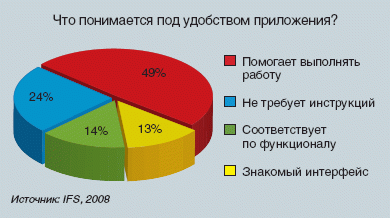 Как выяснилось, Таким образом, большинство респондентов, опрошенных компанией IFS, полагают, что используемые решения негативно влияют на производительность сотрудников. Одной из главных целей исследования было выяснить, что же пользователи понимают под удобством информационной системы. Почти половина сотрудников полагает, что такая пользовательская характеристика, как удобство, означает, что программное средство помогает выполнять работу лучше и быстрее. Помимо этого, встречались мнения, что удобное ПО не требует изучения инструкции, выглядит как уже знакомые продукты и соответствует выполняемой работе.