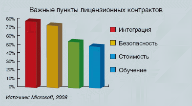 Приобретение программных средств превращается для ИТ-директоров в большую проблему. Как показали результаты опроса, проведенного Microsoft, 63% респондентов заявило, что переговоры на эту тему с вендорами являются для них чрезвычайно важными, а сама процедура все усложняется. Более того, две трети считают, что тяжело проходившие торги с поставщиками ПО стали одной из причин нарушения сроков проектов. Естественно, ИТ-директора ждут от вендоров большей гибкости, и многие из них отмечают, что ее недостаток негативно повлиял на сделку. Другой проблемой является составление лицензионного соглашения. Обычно оно состоит из смеси технического и юридического языка, весьма сложной для понимания. Большинство компаний прикладывает существенные усилия для прояснения всех пунктов контракта, но есть и такие, кто полагается на порядочность поставщика. Основной проблемой при обсуждении контракта обычно становятся не финансовые вопросы, а гарантии, связанные с интеграцией и безопасностью.