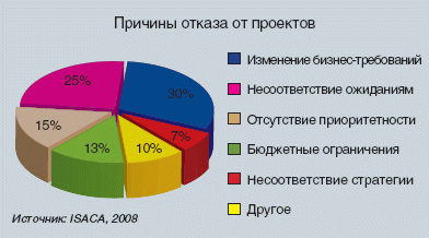 Почти половина ИТ-проектов прекращается еще до завершения процесса внедрения, как заявляют эксперты ассоциации ISACA (Information Systems Audit Control Association). При этом около трети опрошенных компаний заявили, что это происходит из-за изменившихся бизнес-потребностей. Еще 25% сообщили, что проект не принес бы им ожидаемых результатов. В качестве прочих причин назывались отсутствие у проекта приоритетности и бюджетные ограничения. Лишь 6,6% прекращало проекты из-за их несоответствия бизнес-стратегии. Несмотря на кажущуюся на первый взгляд удручающей картину, аналитики смотрят на полученную статистику довольно оптимистично. Они отмечают, что завершение проектов, не соответствующих потребностям компании и ожиданиям пользователей, говорит о растущей согласованности ИТ и бизнеса. Другое дело, что в идеальном варианте потенциальные проблемы могут быть обнаружены еще до начала проекта. В случае же изменившихся бизнес-требований вполне возможно не только закрытие, но и модификация проекта в соответствии с новыми условиями.