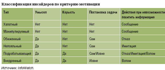 Интересную классификацию инсайдеров, помогающую четче определить этот термин, предлагает российская компания InfoWatch (см. таблицу). Специалисты компании в качестве критерия предлагают использовать наличие умысла и корысти в действиях. Такой подход позволяет лучше понять цели и мотивацию инсайдеров и выбирать средства защиты, которые будут максимально эффективны.