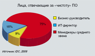 В 75% компаний существует разработанная политика управления используемым ПО, однако 38% из их признает, что имеет лишь приблизительное представление о ситуации с использованием лицензий. Как подчеркивают в IDC, последствия этого могут быть как юридическими, так и финансовыми: неэффективное использование лицензий в крупной компании ведет к значительным потерям. Несмотря на то, что многие компании понимают важность данной проблемы, ее решение не выносится на высший уровень. Лишь в 9% компаний за легитимность используемого программного обеспечения отвечает член совета директоров. Еще в 16% ответственность возлагается на ИТ-директора, а в остальных случаях она спускается еще ниже — на уровень ИТ-департамента или менеджеров отдельных бизнес-подразделений.