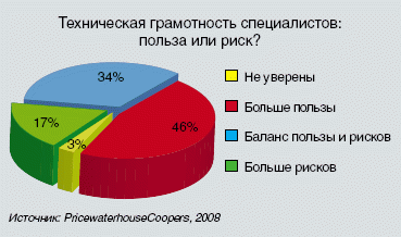Руководство большинства компаний уверено, что к 2013 году сотрудники компаний будут настолько технически подкованными, что смогут без проблем работать со всем информационным инструментарием. Оптимизм по этому поводу выразило 82% бизнес-руководителей, опрошенных PricewaterhouseCoopers. В крайнем случае персонал будет способен освоить нужные ИТ-решения в кратчайшие сроки. В том числе речь идет и о сотрудниках низшего звена. Довольно оптимистичны руководители и в видении своего будущего: 75% полагают, что через пять лет будут ясно представлять, каким образом каждая технология помогает в осуществлении бизнес-целей. Вместе с тем повышение роли технологий и растущая техническая грамотность персонала вызывают и определенную озабоченность. Значительная часть руководителей видит в этом рост рисков для компании. Тем не менее большинство признает, что польза от технически грамотных сотрудников гораздо больше, чем возникающие риски.