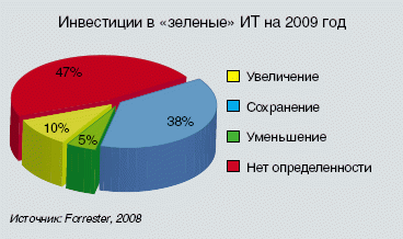 Инвестиции в «зеленые» инициативы, несмотря на кризис, остаются стабильными. Более того, увеличение компаниями этой части бюджета наблюдается вдвое чаще, чем сокращение. Согласно результатам опроса, проведенного Forrester, 38% организаций планируют сохранить инвестиции в свое «озеленение», 10% — увеличивают их, а 5% — сокращают. Нетрудно заметить, что данная тенденция на абсолютную точность не претендует: почти половина компаний выразили неопределенность относительно своих действий в будущем. Говоря о мотивировке осуществляемых проектов, большинство опрошенных назвало главной целью снижение счетов за потребленную электроэнергию. Еще треть заявила, что «зеленые» инициативы проводятся в масштабе всей организации, и консолидация ИТ, равно как и установка более экономичного оборудования, является частью более широкой программы.