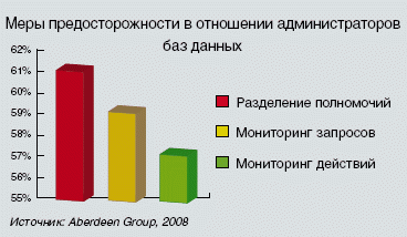 Как известно, одним из самых опасных каналов утечки конфиденциальной информации являются ИТ-сотрудники. Их отличие от обычных пользователей заключается не только в правах доступа. Если действия большинства сотрудников, приводящие к негативным последствия, происходят по неосторожности, то в случае ИТ-персонала поступки всегда мотивированы. При этом в руки внешнего заказчика попадает наиболее ценная информация. Мониторинг действий ИТ-персонала — например, администраторов баз данных — может служить одной из самых надежных мер защиты информации. Надо отметить, что во многих компаниях это прекрасно понимают. 57% опрошенных Aberdeen Group компаний отслеживают действия системных администраторов, а еще большее число осуществляют мониторинг нестандартизованных запросов и не дают администраторам полного доступа к базе, разделяя их обязанности. По признанию респондентов, две трети конфиденциальной информации содержится в корпоративных базах данных, поэтому слежка за ответственными лицами в данном случае вполне оправданна.
