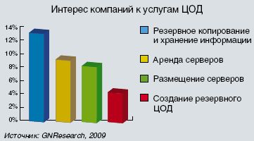 Как выяснилось, 46% опрошенных просто не знают, что такое ЦОД. Из тех же, кто имеет представление об услугах коммерческих ЦОД, 20% допускают возможность использовать такие услуги в ближайшие два года. Имеют определенный опыт передачи обслуживания своей ИТ-инфраструктуры сторонним ЦОД лишь 2% организаций. В удаленном резервном копировании и хранении информации испытывают потребность 13% малых и 7% средних компаний, а чуть меньшее количество заинтересовано в аренде серверов и размещении собственных серверов в ЦОД (услуги dedicated и colocation). 4% рассматривают возможность создания резервного ЦОД.