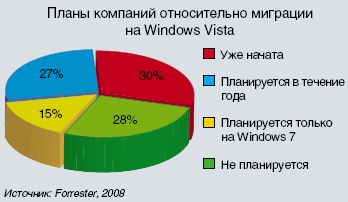 Почти треть европейских и американских компаний начали использовать Windows Vista, как подсчитали аналитики Forrester. Таким образом, лишь через два года после выхода этой операционной системы среди ИТ-менеджеров наметилось определенное «потепление» по отношению к ней. На сегодняшний день ее проникновение в корпоративную ИТ-структуру составляет около 10% — в среднем именно такой процент компьютеров работает на Vista. Еще 27% планируют начать ее использование в течение 2009 года. Однако на эти планы может повлиять экономическая нестабильность: Vista приобретается, как правило, с новыми компьютерами, а именно расходы на «железо» становятся первыми кандидатами на сокращение при оптимизации ИТ-затрат. 15% опрошенных сказали, что планируют, минуя Windows Vista, перейти сразу на платформу Windows 7, выход которой должен состояться в начале 2010 года. Еще 28% заявляют об отсутствии каких-либо планов миграции. В их числе 3% использующих Mac OS X, и 2% пользователей Linux.