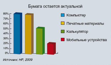 Документы на бумажном носителе по-прежнему остаются основными «рабочими инструментами» в процессе принятия решений. Как показало исследование, проведенное HP, бумажные носители используют 77% опрошенных руководителей компаний среднего и малого бизнеса, 78% респондентов при принятии решений регулярно используют ПК и ноутбуки, 51% — калькуляторы и 19% — мобильные устройства. Таким образом, совершенно очевидно, что, несмотря на разнообразие современных цифровых устройств, печатные материалы и бумажные носители продолжают пользоваться огромной популярностью. Когда нужно принять решение, записать идею или что-либо подсчитать, менеджеры чаще всего прибегают к печатным материалам, бумаге и ручке.
