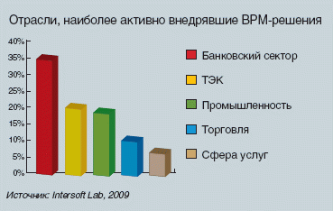 В 2008 году количество новых проектов внедрения систем управления эффективностью предприятия (Business Performance Management, BPM) выросло по сравнению с 2007 годом на 31%. Как подчеркивают эксперты компании Intersoft Lab, это свидетельствует о рекордном сокращении числа внедрений. С 2004 по 2007 год рынок развивался стабильно: от 84% до 95% ежегодно. Замедление роста в прошлом году объясняется финансовым кризисом, который заставил компании сократить ИТ-бюджеты, особенно во втором полугодии. В результате большая часть намеченных BPM-проектов была предварительно перенесена на конец 2009 года. Тройку самых распространенных задач, которые в 2008 году решали с помощью BPM-систем, составили финансовая консолидация, подготовка регулятивной отчетности, планирование и бюджетирование. Активнее всего такие решения внедряли банки, предприятия ТЭК, промышленные и торговые компании. Согласно прогнозам IDC, мировой рынок BPM испытает негативное влияние кризиса в минимальной степени: внедрение аналитических приложений, хранилищ данных и инструментов Business Intelligence находится на подъеме. Российский же рынок BPM в нынешнем году оживится по сравнению с прошлым, но темпы роста будут далеки от прежних показателей. Нового всплеска активности внедрений стоит ожидать не ранее чем в 2010—2011 годах.