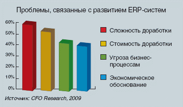 Общеизвестно, что сопровождение и модернизация ERP-систем в соответствии с требованиями бизнеса — занятие дорогостоящее. Даже изначальные затраты на приобретение и внедрение ERP весьма значительны. Как правило, компании тратят на лицензии и внедренческие услуги никак не меньше 250 тыс. долл., а в половине случаев затраты превышают 1 млн. долл. По оценкам организации CFO Research, реальные расходы еще выше: в указанные суммы не включены внутренние расходы, связанные, например, с управлением проектом или обучением пользователей. Однако в процессе функционирования системы затраты на нее продолжают увеличиваться: решение должно развиваться вместе с компанией. Большинство компаний даже после внедрения несут существенные потери из-за необходимости адаптировать решения к бизнес-потребностям. При этом 76% дорабатывают функциональность систем или даже дописывают новые модули, а 67% проводят интеграционные проекты. В 17% компаний необходимые доработки достигают таких масштабов, что принимается решение о перевнедрении систем.
