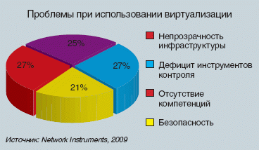 Большинство компаний испытывает серьезные проблемы с использованием технологии виртуализации. В силу этого ожидаемые от ее внедрения преимущества удается получить далеко не всегда. Виртуализация находит все более широкое применение: по данным Network Instruments, более половины использующих ее компаний переводят на виртуальную платформу критичные для бизнеса приложения и сервисы. Наиболее распространен этот подход в отношении серверов, поддерживающих работу электронной почты и Web-порталов. Более того, около 40% компаний заявляют о выходе виртуализации на уровень рабочих станций. Однако 55% опрошенных признаются, что получают от виртуализации больше головной боли, чем преимуществ. Среди главных проблем называются недостаточная прозрачность полученной инфраструктуры и дефицит средств для контроля эффективности работы виртуального оборудования, а также отсутствие у сотрудников необходимых компетенций. Еще 21% выражает озабоченность вопросами безопасности виртуальной инфраструктуры. В целом для 60% компаний практически непреодолимым барьером становится управление технологией. Еще 50% жалуются на то, что внедрение виртуализации обходится слишком дорого.