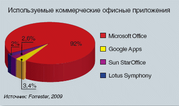 Microsoft Office различных версий является корпоративным стандартом коммерческих офисных приложений для 92% компаний. 3,4% используют Google Apps, 2,6% — Sun StarOffice, а 2% — Lotus Symphony. Совершенно очевидно, что Microsoft Office удовлетворяет абсолютное большинство компаний. Как иронизируют аналитики Forrester, возможно, приложения Microsoft работают слишком хорошо, с учетом того, что зачастую компании до сих пор используют Office 2003 и даже более старые версии. Тем не менее миграция на новую версию офисных приложений планируется в 40% компаний. Планы были более решительными, но экономическая нестабильность отложила намерения многих организаций. Несмотря на финансовые факторы, мало кто обращает внимание на более дешевые альтернативные продукты. Основная причина этого — большое количество унаследованных документов и интегрированность продуктов Office между собой. Что еще хуже, далеко не все компании, использующие альтернативные решения, удовлетворены своим выбором. 29% таких организаций оценивают свою удовлетворенность на два балла по пятибалльной шкале, а 43% — на три балла.