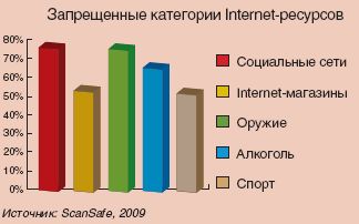 Как показало исследование, проведенное компанией ScanSafe, в первую очередь это касается социальных сетей. За последние полгода число компаний, относящих такие ресурсы к нежелательным, увеличилось на 20%. Таким образом, в 76% организаций посещение социальных сетей в рабочее время не просто не одобряется руководством, но и пресекается на техническом уровне. Другими распространенными объектами блокировки являются Internet-магазины, сайты, посвященные оружию и алкоголю, а также спортивные информационные ресурсы. Разумеется, в данном «хит-параде» представлены только вполне добропорядочные категории Web-сайтов, признанные мешающими рабочему процессу. Подразумевается, что порнографические ресурсы, равно как и ресурсы, связанные с незаконной деятельностью, традиционно блокируются практически во всех компаниях. Однако в последнее время руководители стали обращать особое внимание на эффективность сотрудников. В непростой экономической ситуации от персонала требуют более напряженной работы, кстати, иногда за меньшее вознаграждение.